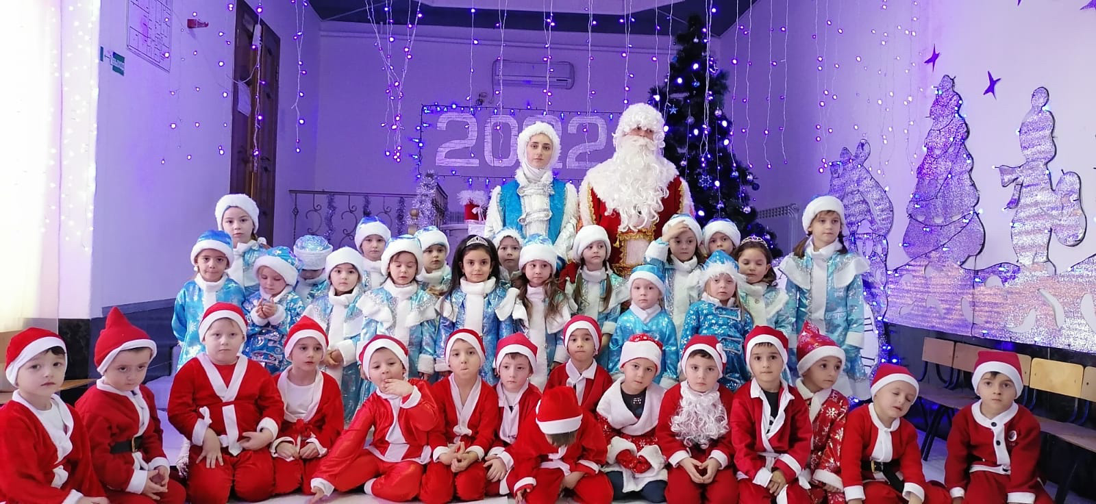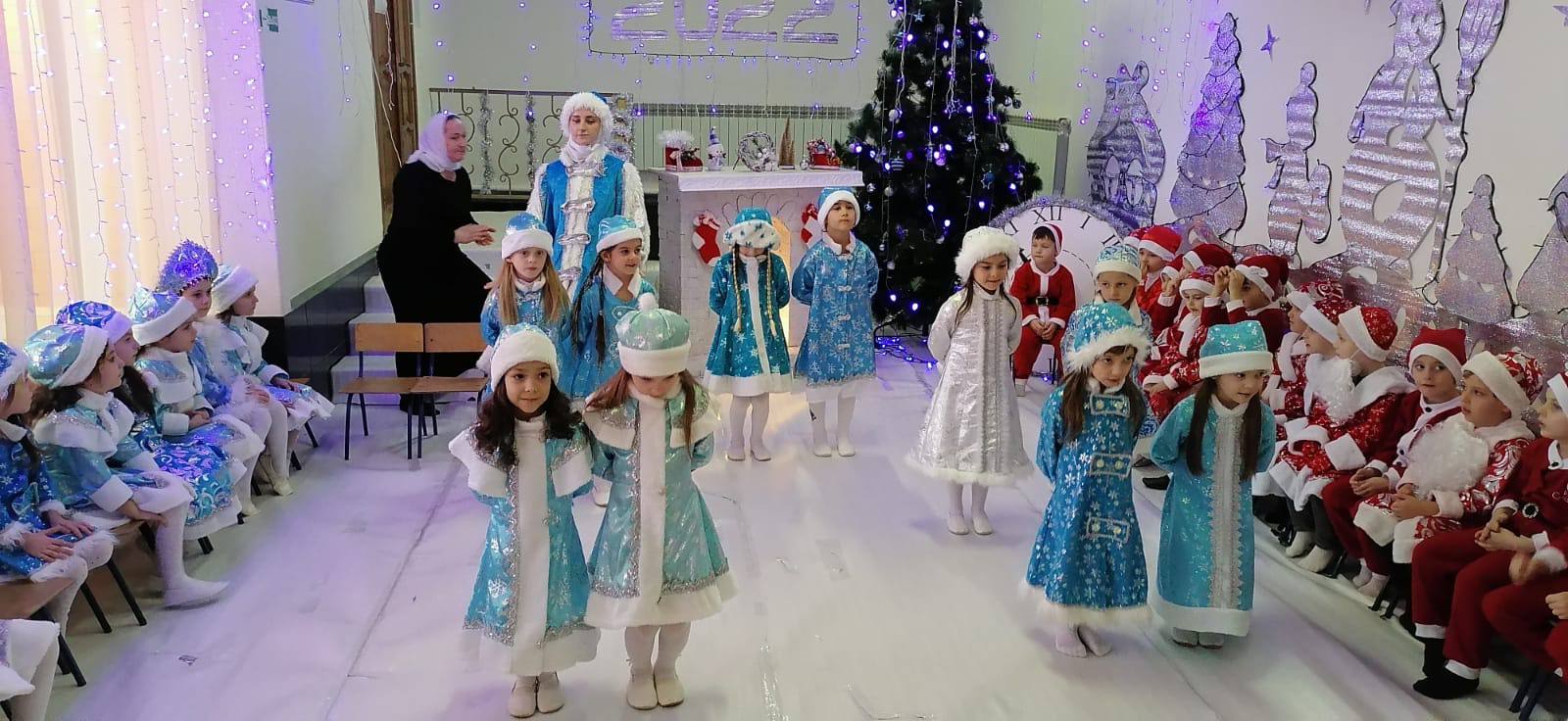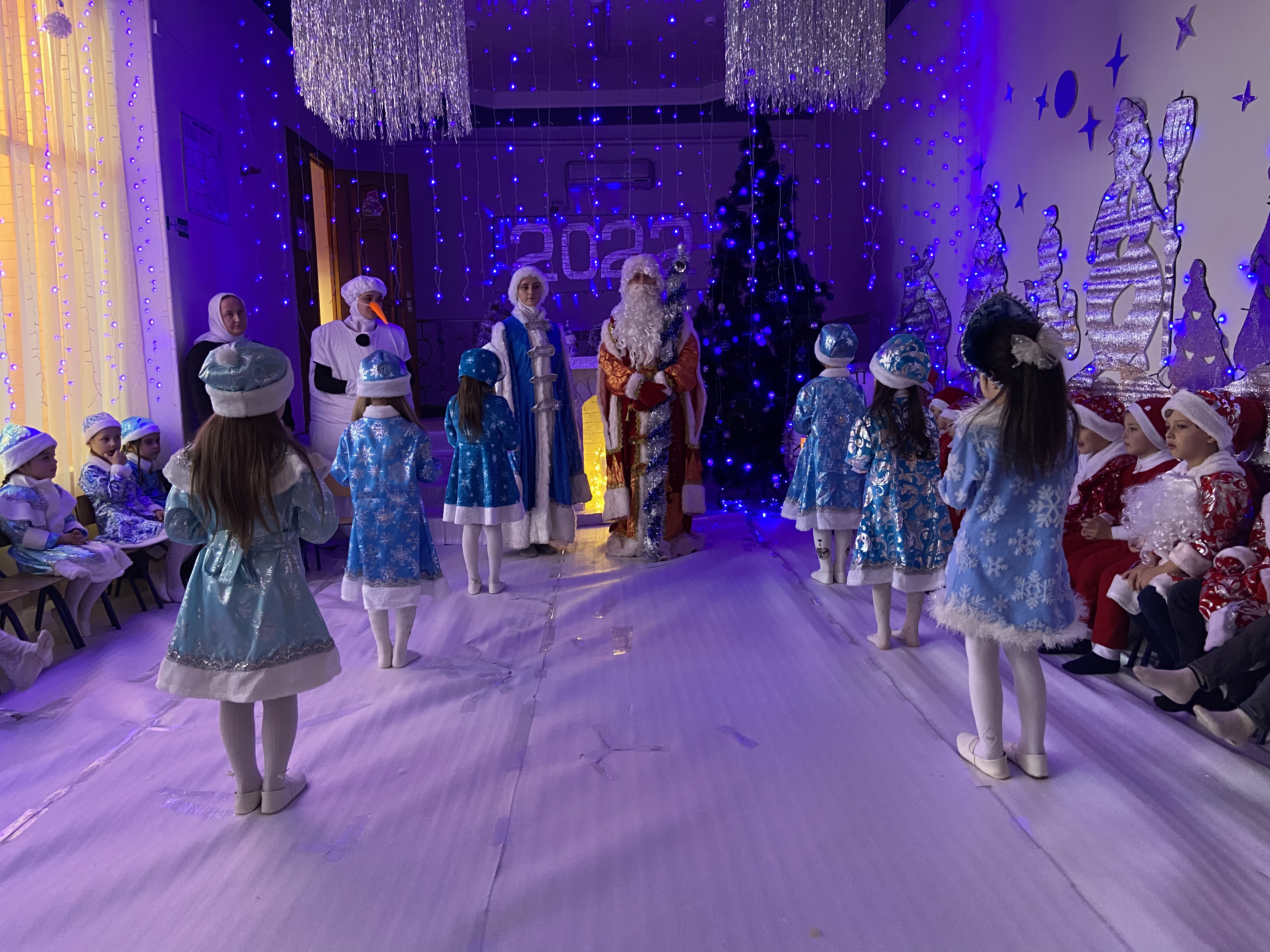 Дети пришли на представление нарядные мальчики в костюмах Дедов Морозов, а девочки в костюмах Снегурочек, весёлые в предвкушении праздника. И их надежды оправдались. Воспитатели и весь персонал, участвовавший в новогоднем представлении, проявили себя хорошими артистами, показав всё своё творческое мастерство, артистизм, задор и организаторские способности. Им пришлось перевоплотиться в разных героев: Деда мороза, Снегурочку, Снеговика.